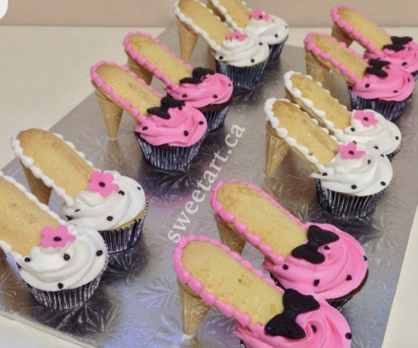 12 heel cupcakes (no bows or polka dots, only pink icing with pearls & white icing with pearls)